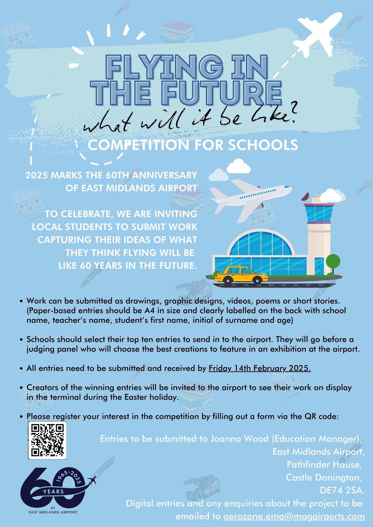 Please find attached the flyer giving details of the East Midlands Airport ' Flying in the Future' competition to celebrate the airport's 60th Anniversary.