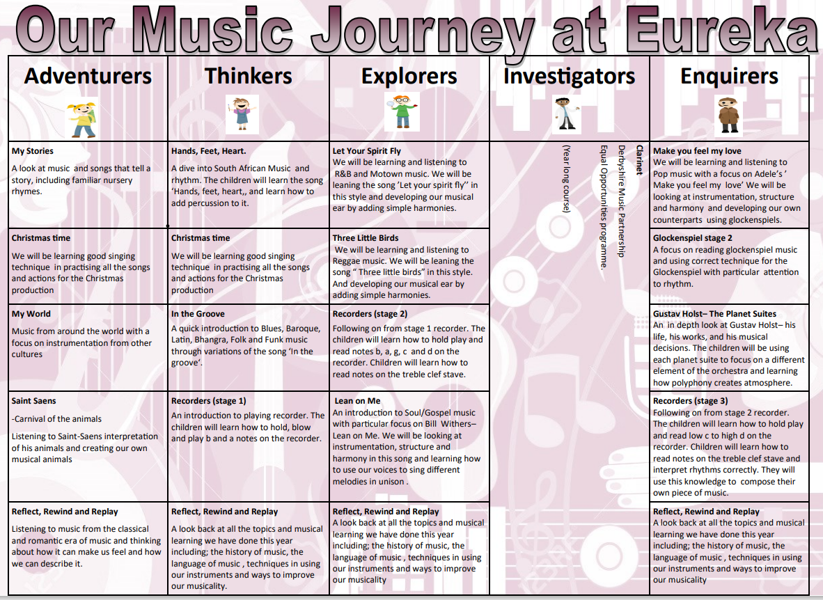Here at Eureka we view music as a unique way of communicating that can inspire and motivate pupils.  It is a universal language that allows children to express their creativity, build self-confidence, gain a sense of achievement and feel part of a community.  We aspire to provide high quality music education for all and to develop a love of music.